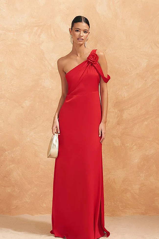 • Lady Pipa eleva la elegancia con un vestido largo de escote asimétrico y detalle floral en el hombro, una opción versátil para bodas tanto de día como de noche.