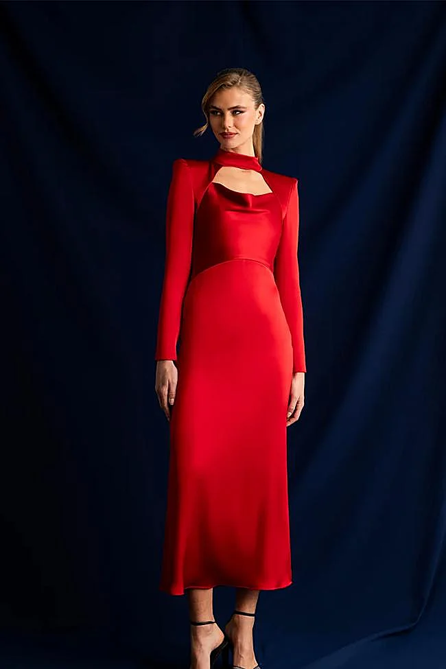 La clave está en la pureza de las líneas y en la contención. Vestidos midi de corte limpio, siluetas columna, capas fluidas y trajes sastre femeninos en rojo intenso dominan las propuestas. El mensaje es claro: menos exceso, más presencia.