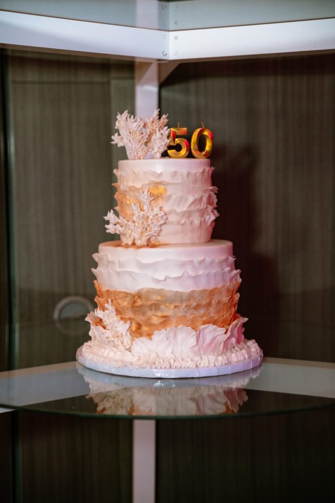 El pastel, de tonos blanco y dorado, fue una verdadera obra de arte, en perfecta sintonía con la temática de la noche. Cada detalle —desde la música hasta la iluminación— reforzó la elegancia y el espíritu festivo que caracterizaron la velada.
