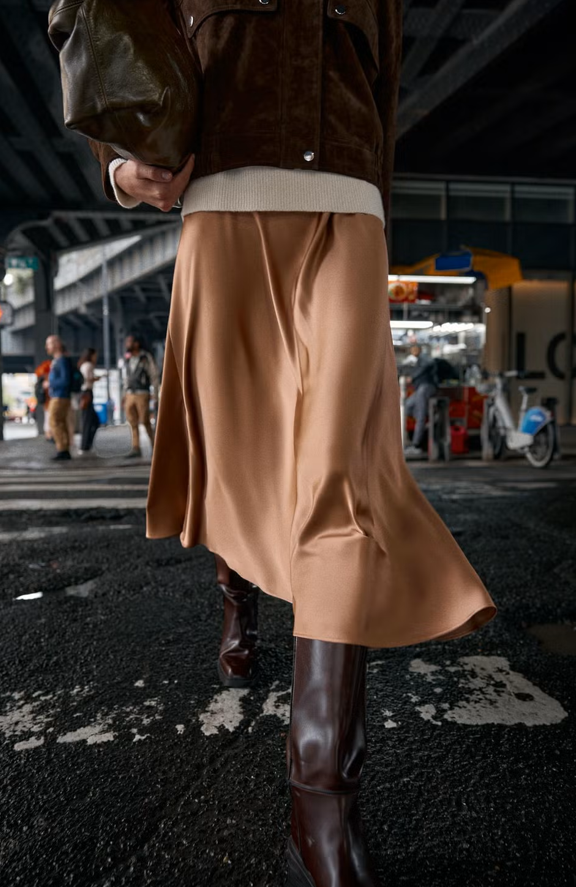 Una de las más sofisticadas de la colección. Su tejido satinado y caída fluida evocan la elegancia de las grandes firmas. Ideal para looks de oficina o cenas especiales, combina de maravilla con una blusa blanca y botas altas color beige.
