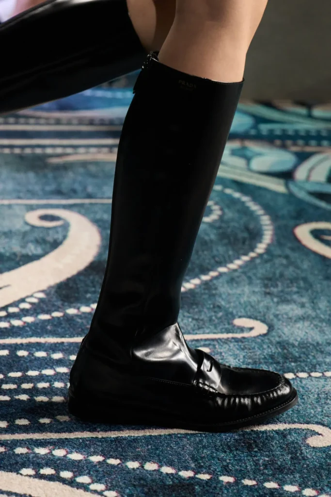 Entre las protagonistas indiscutibles de la temporada destacan las botas tipo mocasín, una creación híbrida que combina la sofisticación de los mocasines con la estructura funcional de las botas altas. Prada y Hermès las presentaron como la nueva definición del confort urbano.