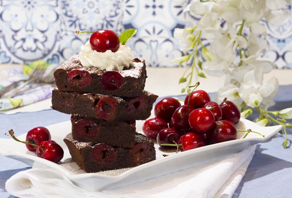 La combinación de chocolate intenso con fruta fresca eleva este clásico a una versión más primaveral. Las cerezas aportan acidez y jugosidad, equilibrando la densidad del brownie.
