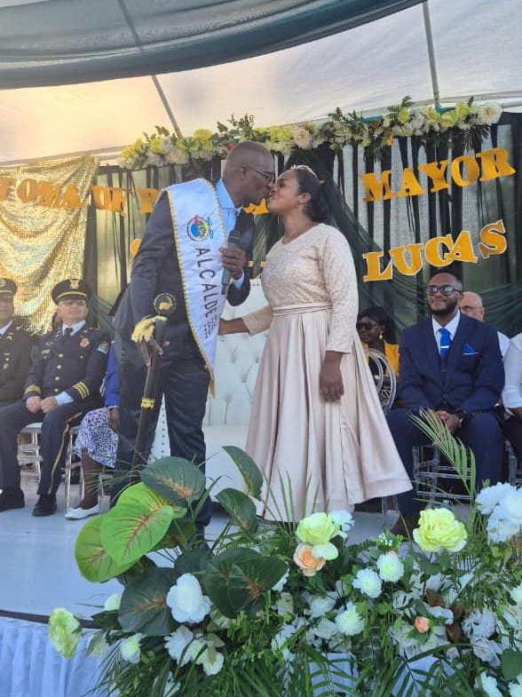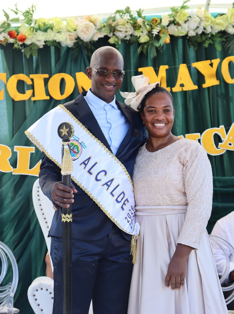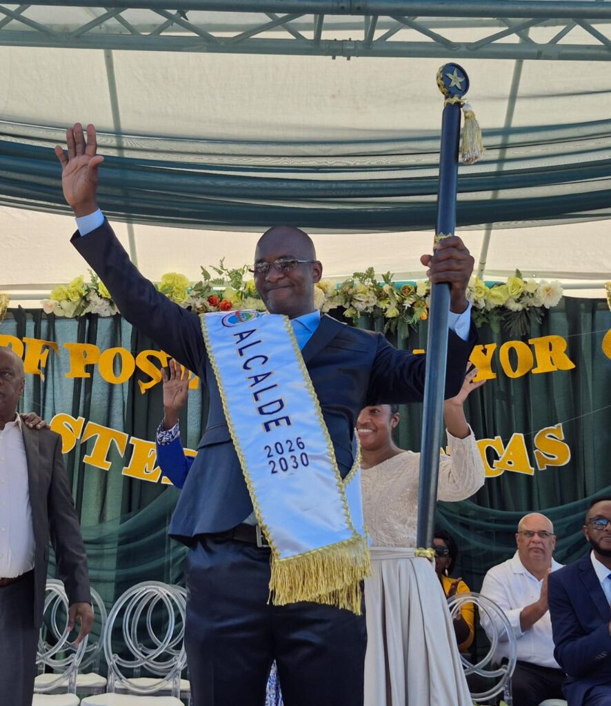 Uno de los momentos más representativos de la jornada fue la imagen del alcalde ya investido con la banda municipal, símbolo inequívoco del traspaso de mando y del inicio formal de sus funciones. Vestido con un traje oscuro de corte clásico, Sterling Lucas proyectó sobriedad y firmeza, sentado en una silla de respaldo alto que reforzaba visualmente la centralidad de su nuevo rol.