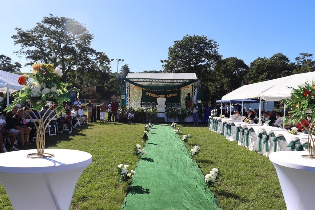 Las carpas laterales, vestidas en blanco con lazos verdes, ofrecieron comodidad a los invitados y mantuvieron una estética uniforme que integró el espacio abierto con el entorno natural del municipio. La decoración, sin excesos, permitió que el protagonismo recayera en el acto mismo y en sus protagonistas.