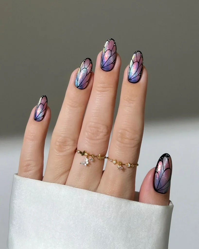 La primavera también se expresa en efectos tornasolados. Las uñas con degradados en violeta, azul y rosa, acompañadas de líneas negras que simulan alas de mariposa, serán una de las propuestas más artísticas del año.