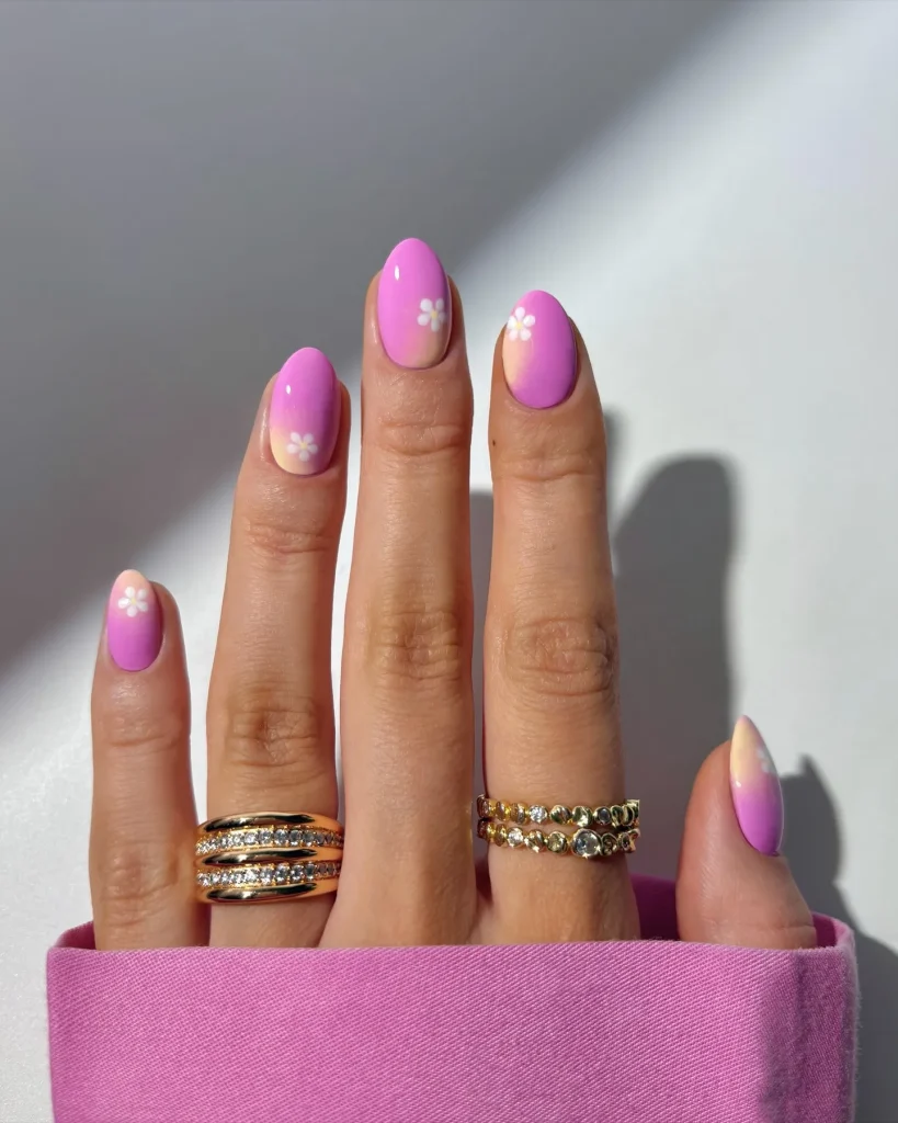 El degradado evoluciona hacia combinaciones más audaces. Rosa chicle con amarillo mantequilla, lila con coral o durazno con fucsia sustituyen a los clásicos neutros.