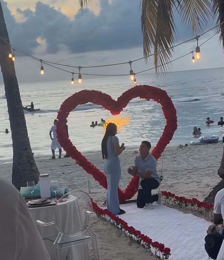 El video, que rápidamente se volvió viral en TikTok, captura el momento exacto en que la novia —con los ojos vendados y el corazón expectante— es guiada por un pasillo de arena hasta llegar a un escenario adornado con un gran corazón de rosas rojas, teniendo el mar como telón de fondo. Allí, su pareja la esperaba con la sortija en mano, rodeado de aplausos, sonrisas y el reflejo cálido de la puesta de sol.