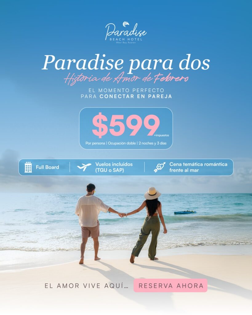 El mes del amor invita a hacer una pausa, mirar a quien camina a tu lado y crear recuerdos que perduren. En este espíritu, Paradise Beach Hotel, ubicado en West Bay, Roatán, presenta su propuesta especial “Paradise para dos”, un paquete romántico diseñado para parejas que desean reconectar frente al mar y celebrar su historia de amor en un entorno paradisíaco.